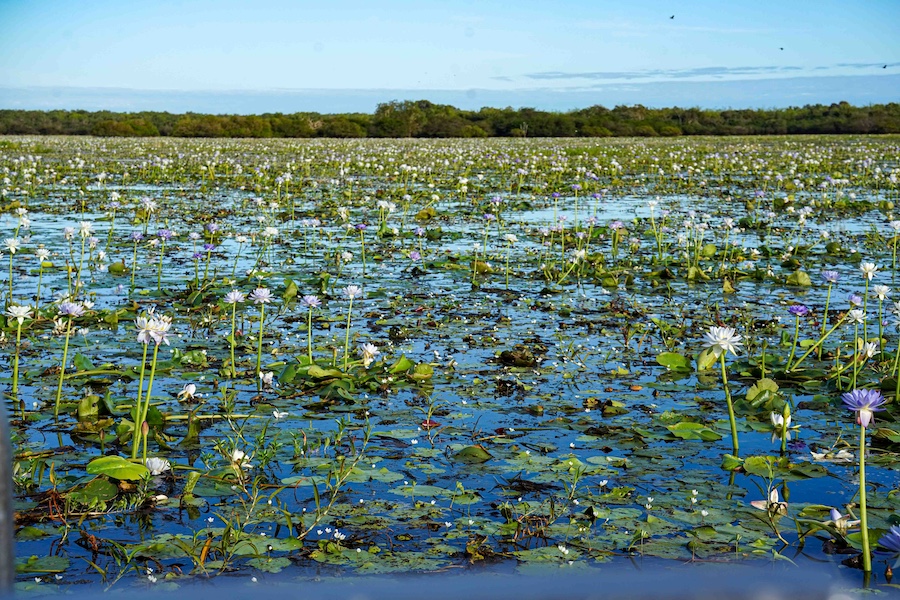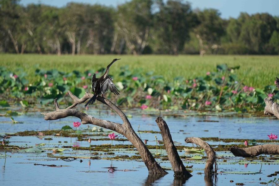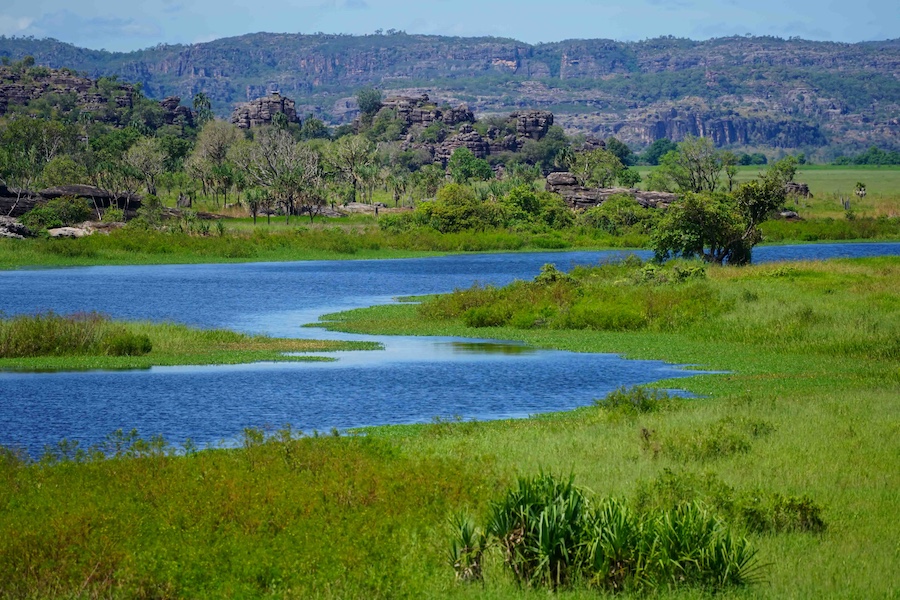 Einer der größten landschaftlichen Höhepunkte des Parks sind die Yellow Water Wetlands, weitläufige Feuchtgebiete, die sich ständig verändern und ein Paradies für Vögel und Wassertiere sind. Wer die einzigartige Erfahrung machen möchte, den Tagesanbruch bei einer Bootsfahrt in den Wetlands zu erleben, muss früh aufstehen. Kraniche und Kakadus begrüßen den Sonnenaufgang, langsam schwindet das nächtliche Grau, und das Spiel der erwachenden Farben zaubert ein völlig neues Bild in die weite Fluss- und Sumpflandschaft. Mit etwas Glück schwimmt ein Krokodil dem Boot entgegen, Auge in Auge, und dann nur drei, vier Meter daran vorbei.